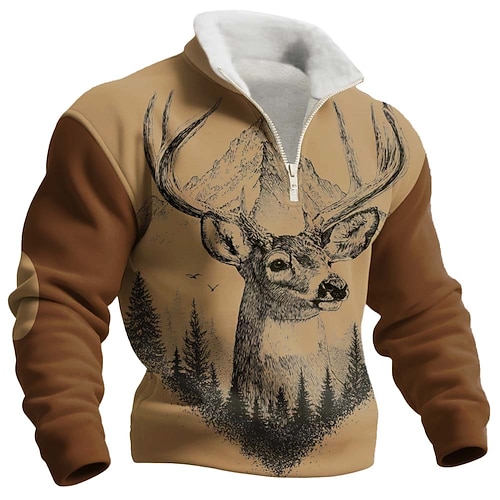Per uomo Cervo Pile Felpa Moda Casual 3D Da caccia Collo alla coreana Zip a un quarto All'aperto Abbigliamento casual alla moda Vacanza Regalo Marrone Cachi Grigio scuro Grigio Mezza cerniera Autunno