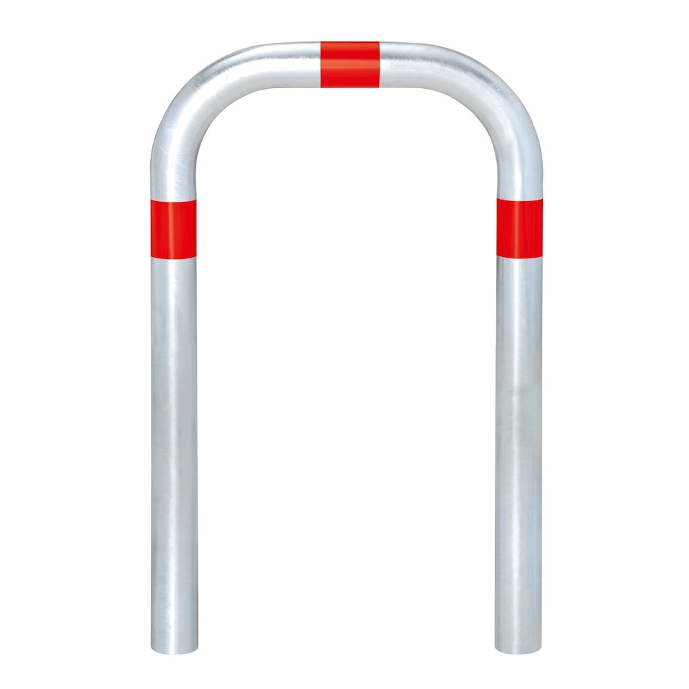 PROREGAL Reflektierender Stahlschutzbügel CITY mit roten Streifen | Ladesäulen-Schutz zum Einbetonieren | HxBxT 80x50x16cm | Rohr-Ø 6cm | Silber/Rot
