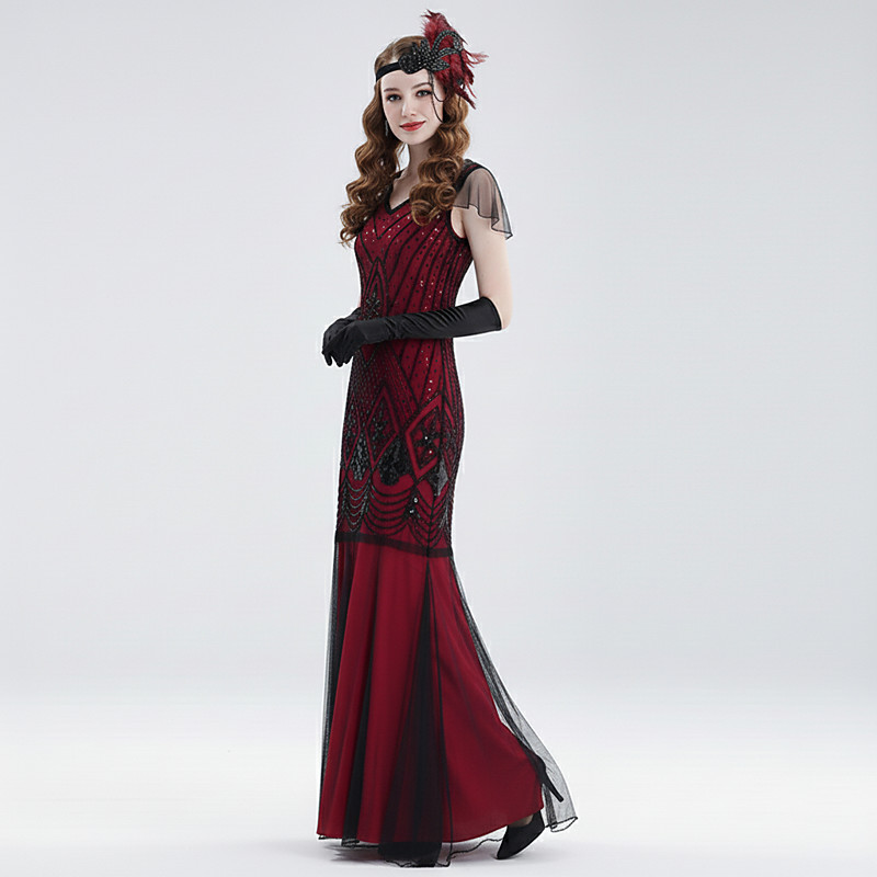 Retro Vintage Roaring 20s 1920s Ankle Length Dress Evening Dress Short Sleeves The Great Gatsby Wedding Guest Sequins V Neck Fancy Dress Women's Masquerade Wedding Party / Evening Evening Party