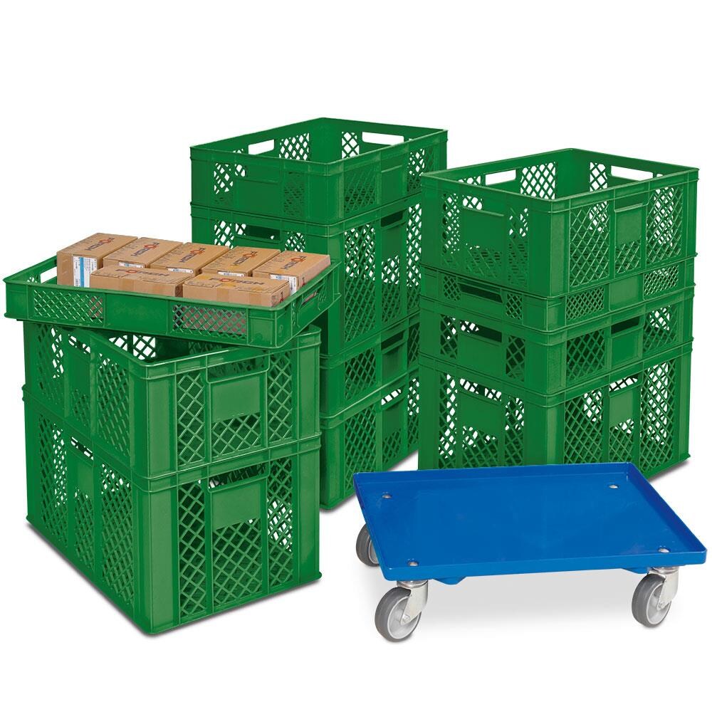 BRB Set mit 11 Euro-Stapelkästen / Bäckerkisten in 4 Größen, Grundmaß 600x400 mm, inkl. 1 Transportroller gratis.