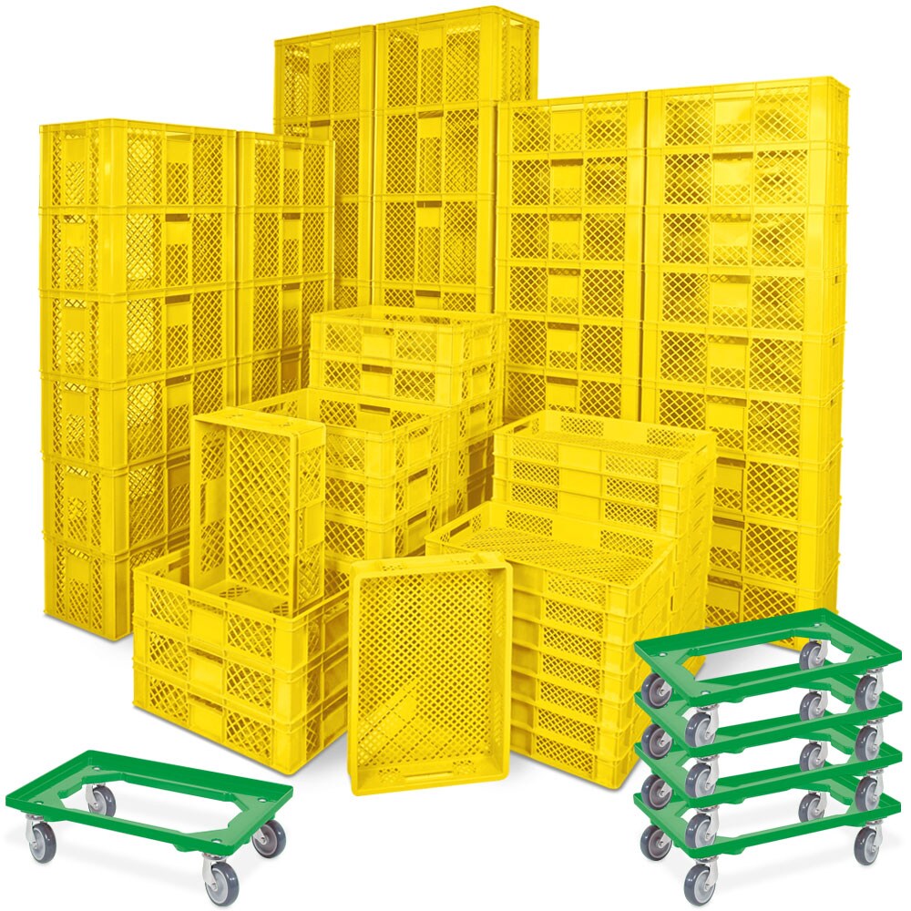 BRB 78 Bäckerkisten in 5 Größen, 600x400 mm, H 90 mm - 410 mm, rot + 5 Roller, gelb