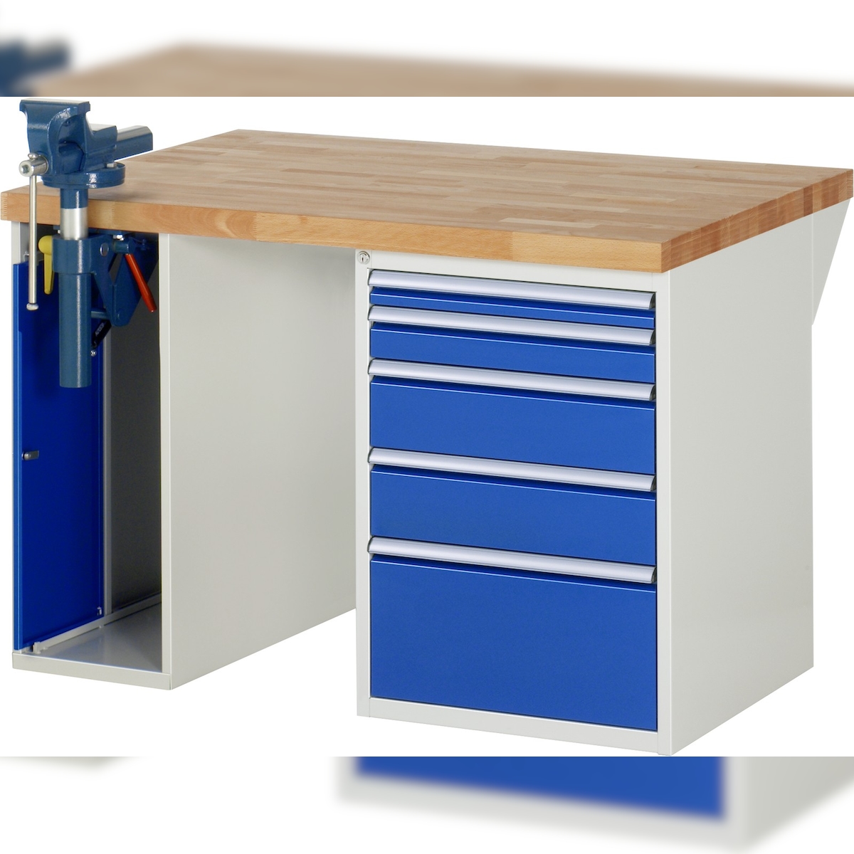 Werkbank, Baukastensystem Serie 7000, 5 Schubladen, 1 Schraubstock linksseitig, BxT 2500 x 700 mm eurokraft pro