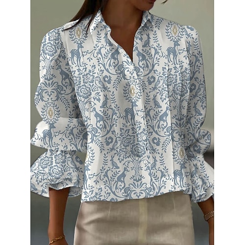 Camicia da Donna in Lino Simile Traspirante Leggero Floreale Grafica Elegante Bohemia Vintage Maniche Lunghe Collo Tops Regolari Giornata Lavoro Festa Rouches Blu Bianco Arancione Beige Estate