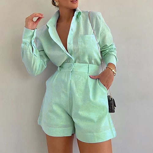 Per donna Elegante Moda Streetwear Set di biancheria in cotone Set di Pantaloncini Bolero Top Manica Lunga Colletto a Camicia Semplice All'aperto Vacanza Ferie Bianco Giallo Rosa Estate Vestibilit