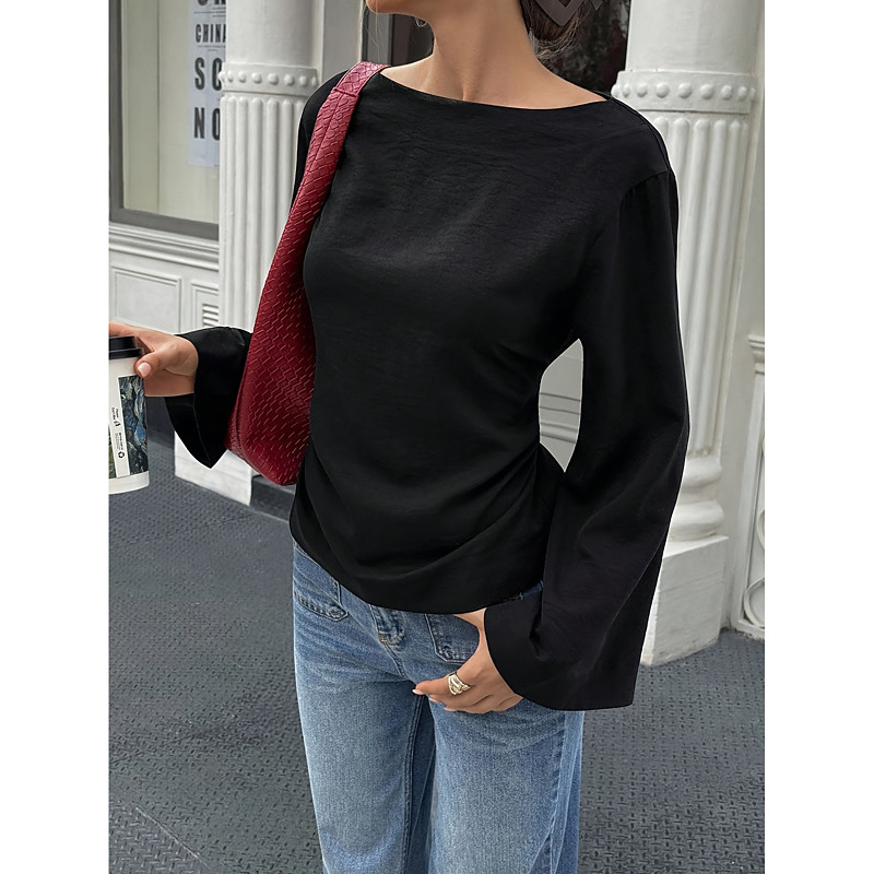 Women's T Shirt Solid Color Stylish Casual Long Sleeve Bell Sleeves Boat Neck Regular Tops Daily Going out Weekend Tunic Black White Brown Spring Fall