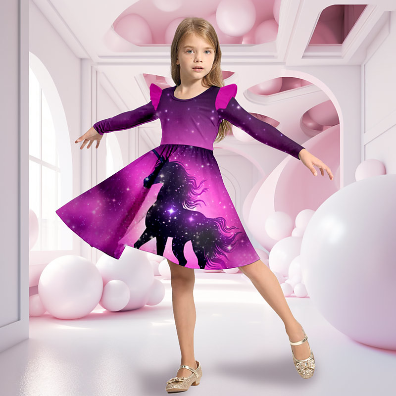 Girls' 3D Galaxy Unicorn Ruffle Dress Long Sleeve 3D Print Fall Winter Vacation Sports Outdoor Daily Cute Casual Beautiful Kids 3-12 Years Casual Dress A Line Dress Above Knee Regular Fit