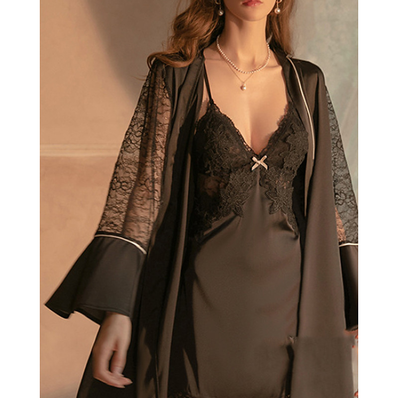 Women's Pajamas Robe Casual Soft Satin Pure Color Lace Daily Home Bed Sleeveless Straps Black White Wine Gold Dark Gray Summer Loose Fit