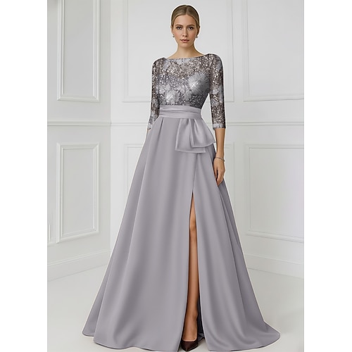 Linea ad A Lunghezza al pavimento Perline ricamate Abito Formale Abito da madre della sposa Abito da Sera Elegante Spacco Alto Manica 3/4 Girocollo Matrimonio Formale Raso Con Paillettes con