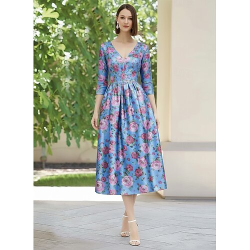 Linea ad A Lunghezza Tè Vestito da Festa Abito da Cocktail Abito da invitata a nozze Abito da cerimonia per signora Manica 3/4 Scollo a V Elegante Festa in giardino Matrimonio Formale Raso Crepe