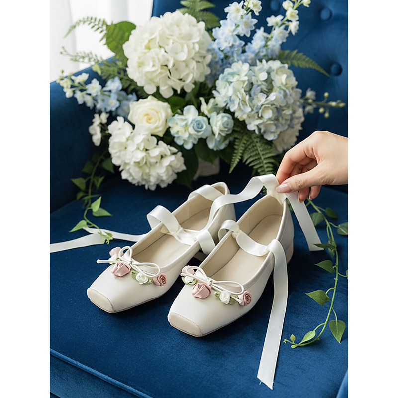 Women's Elegant Pink Satin Bridal Heels with Flower Embellishments – Perfect for Garden Weddings, Bridesmaids Shoes with Ribbon Straps and Low Block Heels