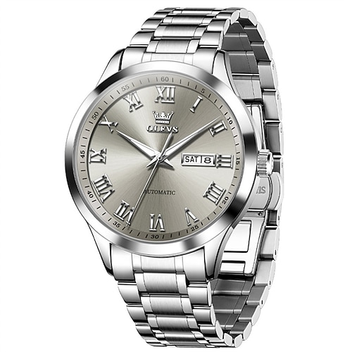Die neue Olevs Herren-Businessuhr mit Edelstahlarmband, Leuchtzeigern, Kalender und Wochentagsanzeige, automatischem mechanischem Design, römischem Zifferblatt, schlichtem und modischem Design,
