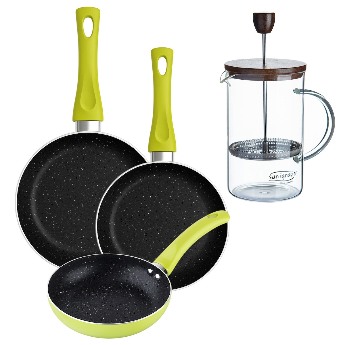 BERGNER - Set aus 3 Pfannen Ø20/Ø24/Ø28 cm gepresstes Aluminium Molen Grün Stempel-Kaffeemaschine aus Borosilikatglas 15,8×10×18,8 cm