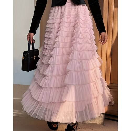 Per donna Tutù Elegante Moda Maxi Vita Alta Gonne Semplice Arricciato Stratificato Inelastico Micro-elastico Vacanza Feste Vinaccia Ametista Nero Rosa Primavera Tulle Poliestere