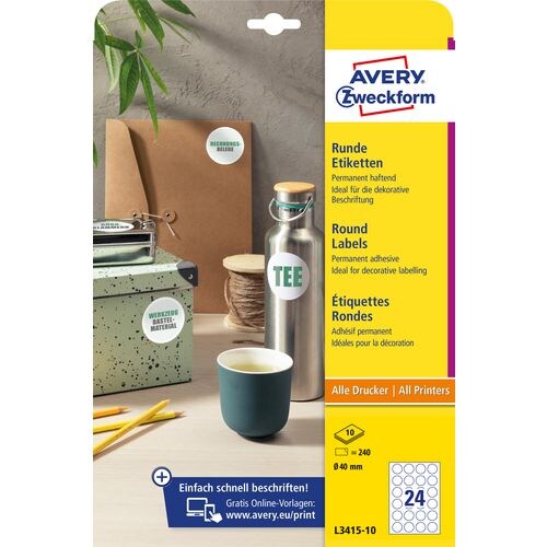 Avery Markierungspunkte L3415-10 Selbsthaftend DIN A4 Weiß 40 mm 10 Blatt à 24 Etiketten