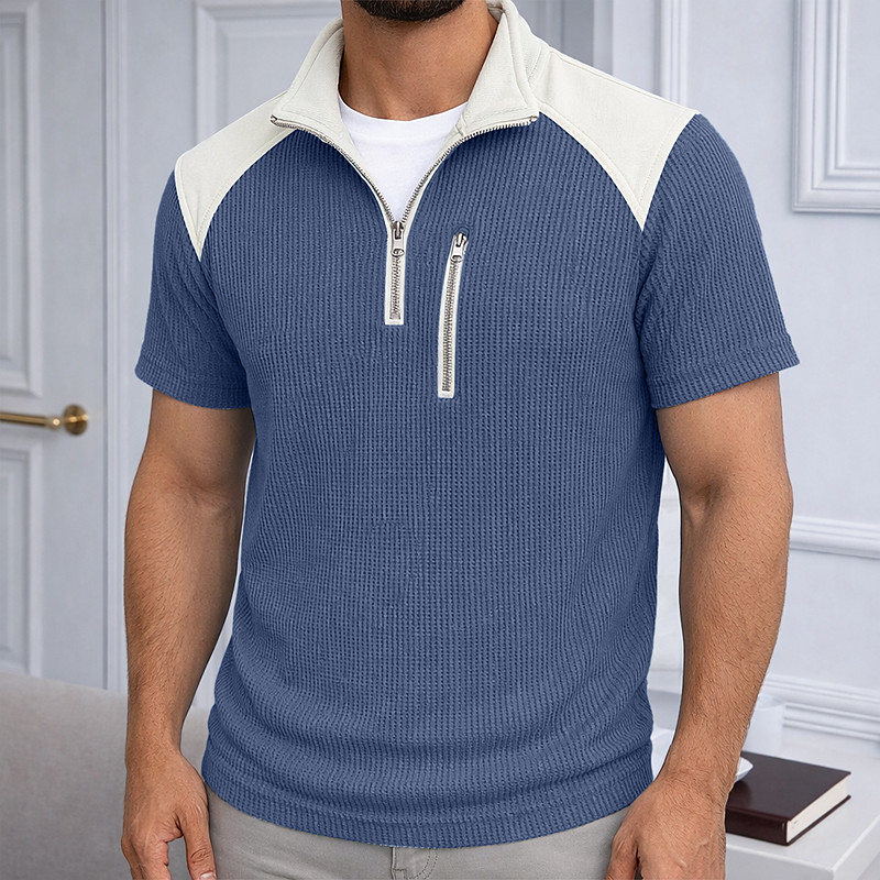 Men's Waffle Knit Tee Tee Top Short Sleeve V Neck Mandarin Collar Summer Spring All Seasons Solid Color Color Block Fashion Designer Casual Buttons Fake two piece Casual Daily Outdoor Light Blue Army