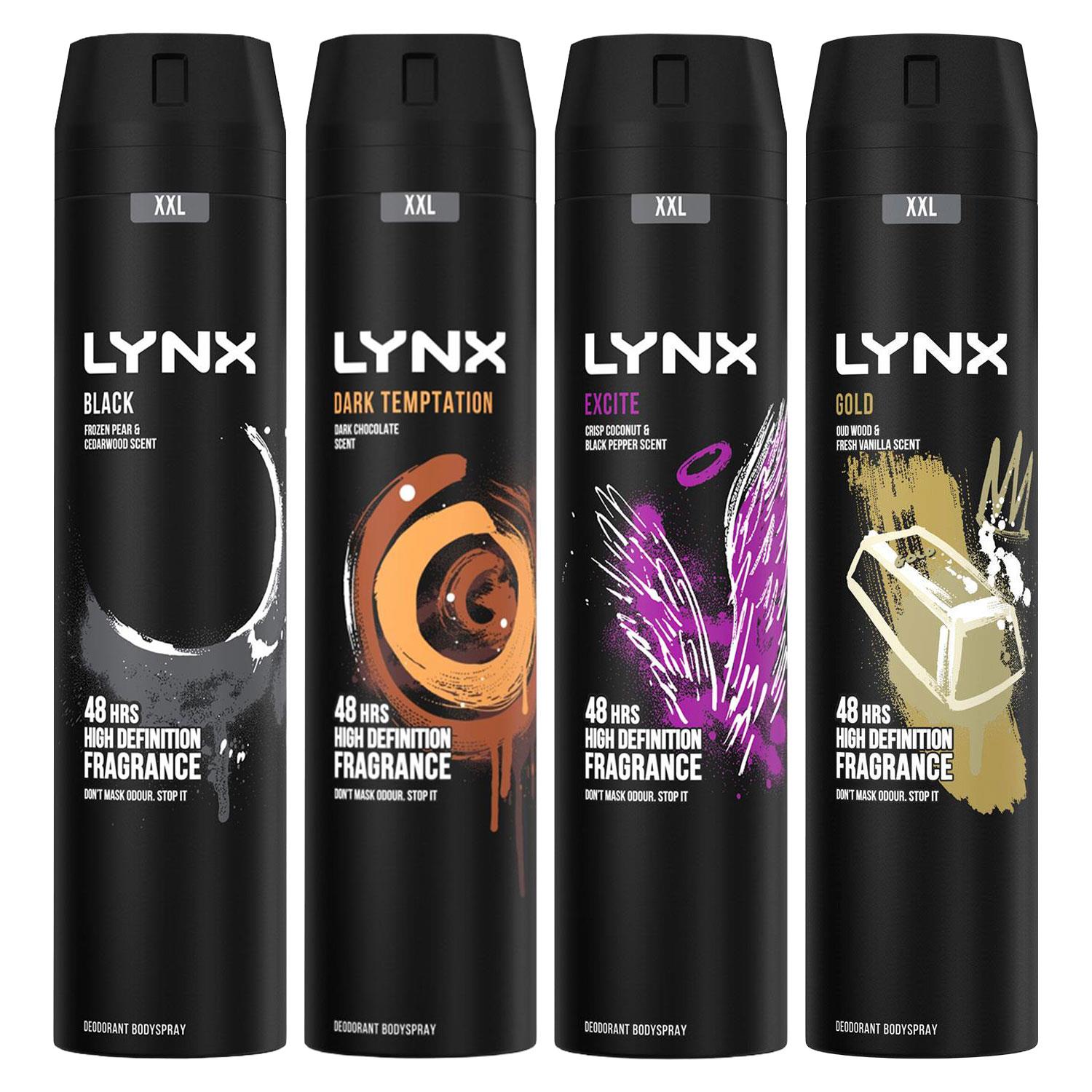 Lynx Mens XXL Body Spray 4pk Bundle of 250ml - Black, Gold, Excite & Dark Temptation - Size 250 ml | Lynx Sale | Discount Designer Brands