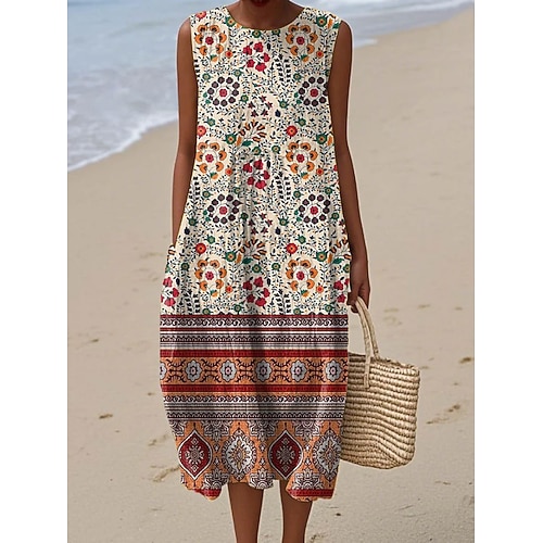 Per donna Abito Midi Vestito Estivo Abito a Tubino Abito a trapezio Vacanza Casual Boho Spiaggia Feste Uscire Vestibilità comoda Floreale Grafico Senza Maniche Girocollo Bianco Verde chiaro Arancione
