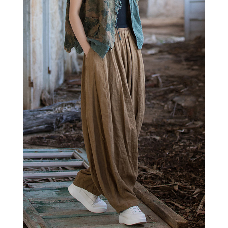 Women's Straight Vacation Vintage Ethnic Style Ankle-Length High Waist Plain Micro-elastic Blue dark brown rice white Black Summer Spring Fall Winter Loose Fit