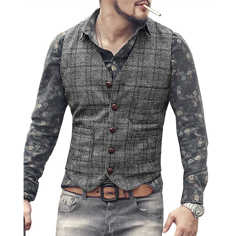 Men's Vest Waistcoat Gilet Vacation Party Business Fashion Casual Spring Fall Pocket Buttons Polyester Comfortable Plaid Single Breasted One-button V Neck Regular Fit Black Champagne Navy Blue Green