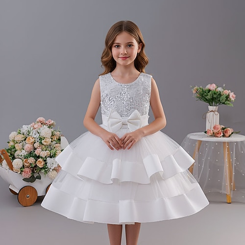 Abito da damigella d'onore bambina Ragazze Abito formale Abiti da sposa Feste Matrimonio Formale Principessa Patchwork Rete Floreale Senza Maniche A V Bianco Champagne Dai 4 anni in su