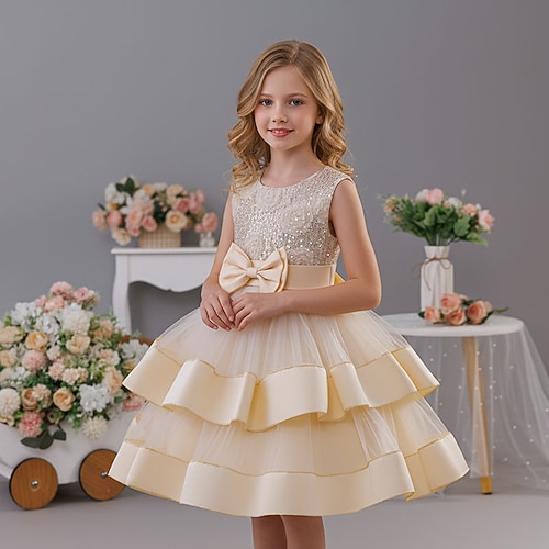 Abito da damigella d'onore bambina Ragazze Abito formale Abiti da sposa Feste Matrimonio Formale Adorabile Principessa Bello Patchwork Rete Tinta unica Maniche Corte Girocollo Champagne Rosa Dai 4