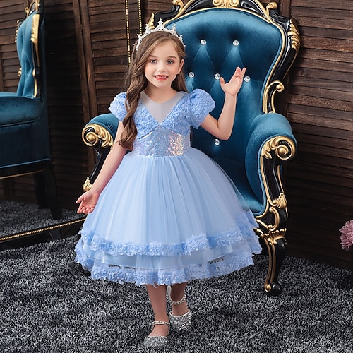 Abito da damigella d'onore bambina Ragazze Abito formale Abiti da sposa Feste Matrimonio Formale Adorabile Principessa Bello Patchwork Rete Tinta unica Manica Corta Girocollo Blu Champagne Dai 4 anni