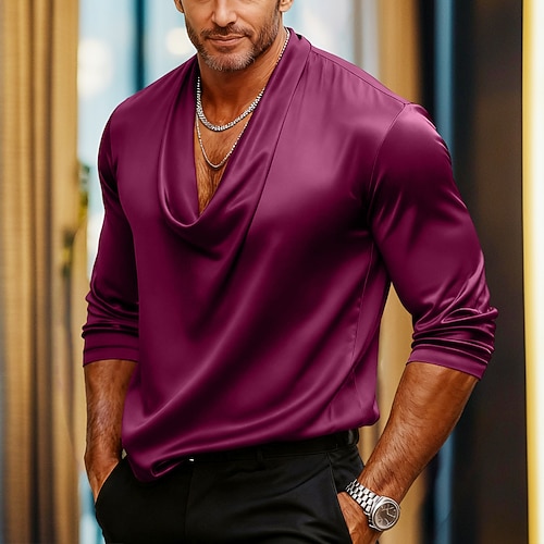 Per uomo Camicia Come la seta Camicia in raso Camicia casual Tinta unica Matrimonio Vacanza Nero Bianco Blu marino Viola Manica Lunga Collo di pile Autunno Primavera Autunno Abbigliamento Arricciato