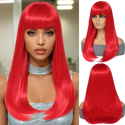 Lange, glatte, rote Damenperücke mit Pony, 61 cm (24 Zoll), synthetisches Vollhaar, für Cosplay, Partys und den täglichen Gebrauch