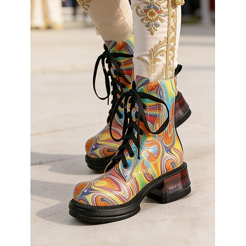 Stivali corto con lacci della stessa tonalità color arcobaleno per donne del Mardi Gras - calzature vibranti da festa stile festival colorato stivali comodi con tacco a blocco per costumi e