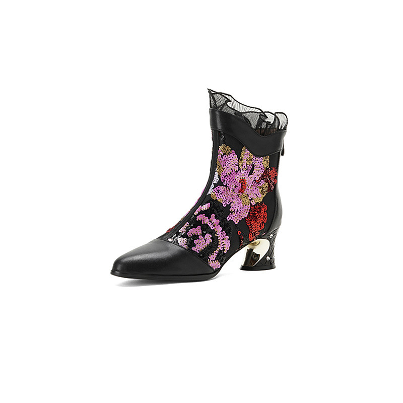 Women's Embroidered Ankle Boots with Pointed Toe, Sheer Ruffle Collar Block Heel - Vintage Floral Style Boots for Women, Perfect for Nightlife Parties and Carnival Festivals