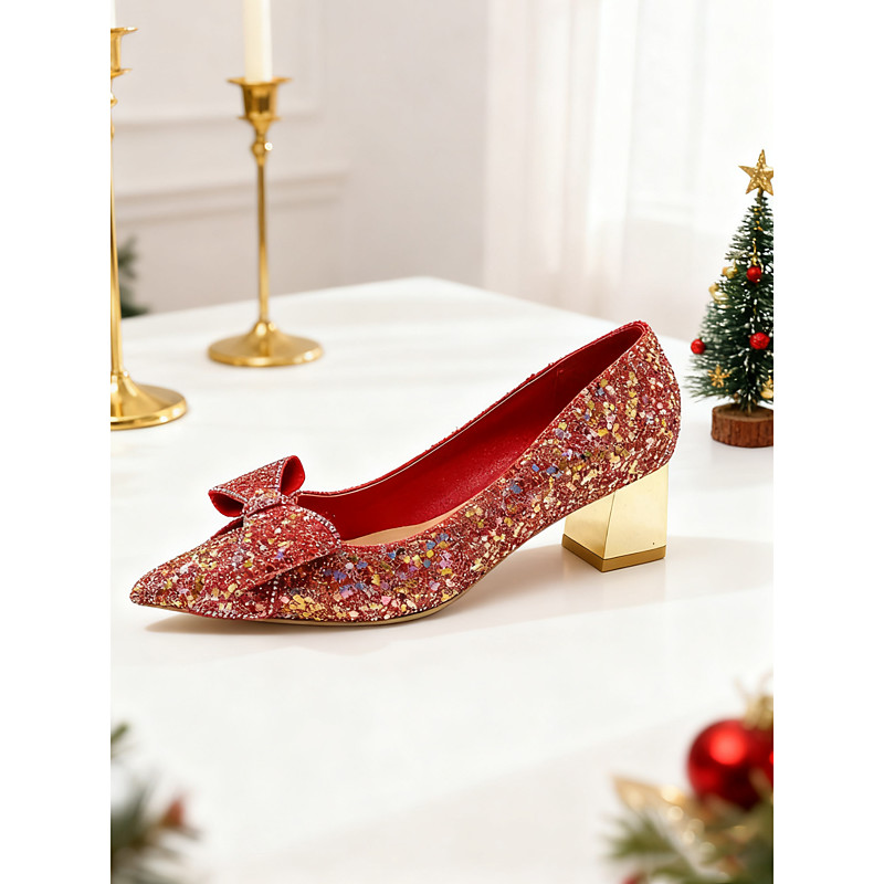 Women's Red Glitter Bow Heels, Sparkly Block Heel Party Shoes with Gold Heel for Christmas Celebrations, Weddings Holiday Evenings