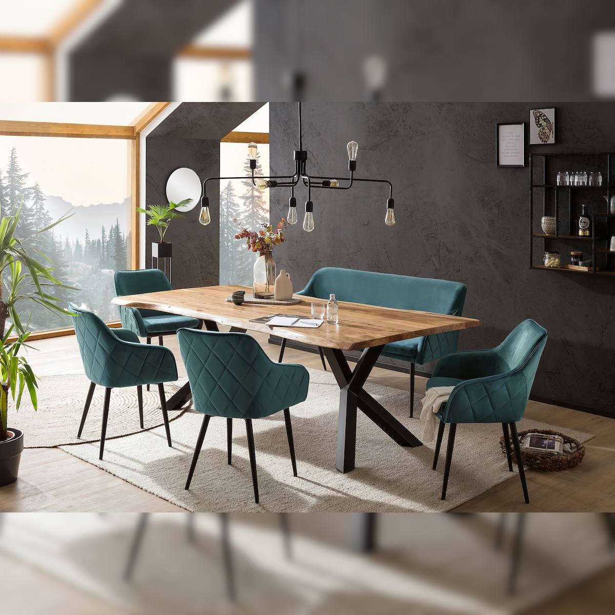 SalesFever 6-tlg. Akazie-Essgruppe 200x100 cm, Platte 35 mm Akazie, Metallgestelle, 4 Stühle & 1 Bank in Samt-Optik