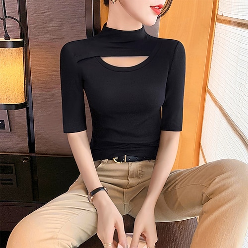 Per donna maglietta Informale Manica corta Collo asimmetrico Top regolari Giornaliero Bottoni Bianco e nero Nero e grigio Estate