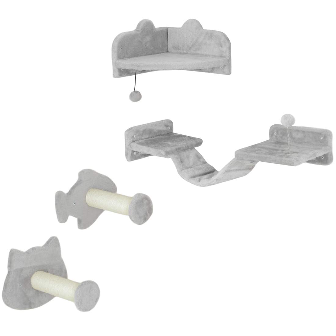 Katteklatreveggsett, 4-delt kattemøbel med trinn, stige, stupebrett, skrapestolper, lekeball, sisal, for katter opp til 5 kg, ly
