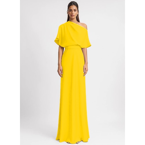 Abito da Sera A-Line Abito Elegante Formale Lunghezza Piena Manica 3/4 Spalla Unica Tasca Crepe Elasticizzato con Pieghe