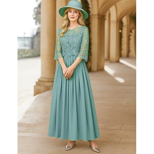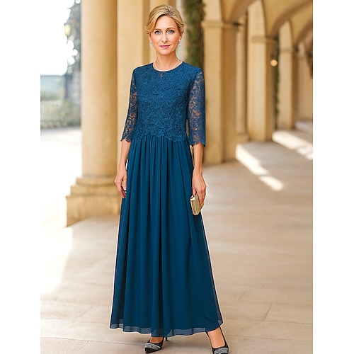 Abito da Ospite di Nozze A-Line di Lunghezza Piena Abiti Formali Abito da Sera Abito per Madre della Sposa Manica 3/4 Collo Rotondo Elegante Formale in Pizzo con Colore Solido