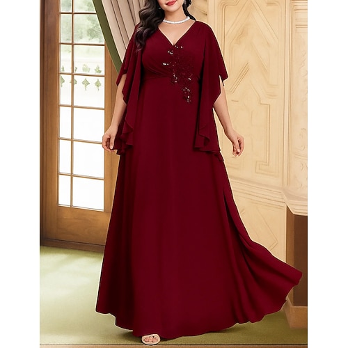 Abito A-Line Vestito da Sera Elegante Abito Formale Matrimonio Lunghezza Piena Manica 3/4 Collo a V Paillettato con Paillettes