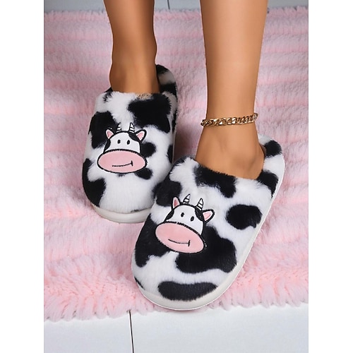 Flauschige Hausschuhe mit Kuh-Print für Damen – süße, plüschige Slipper für den Winter, zu Hause und in der Lounge