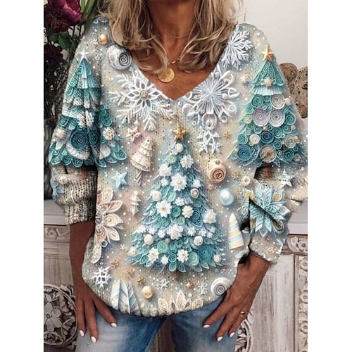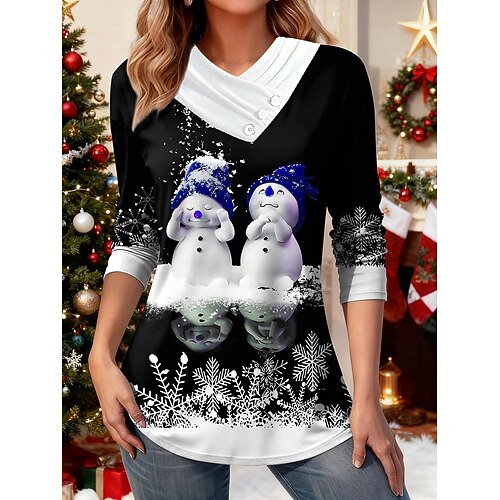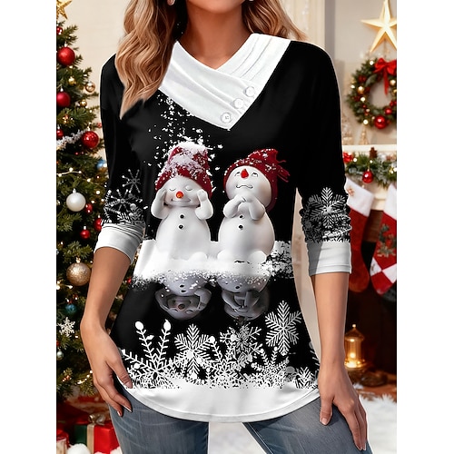 Natale Per donna Maglietta Grafico Pupazzo di neve Fiocco di neve Elegante Casual Manica Lunga Scollo a V Top Regolari Quotidiano Bottoni Stampato Asimmetrico Blu Bianco Giallo Vino Rosso Autunno