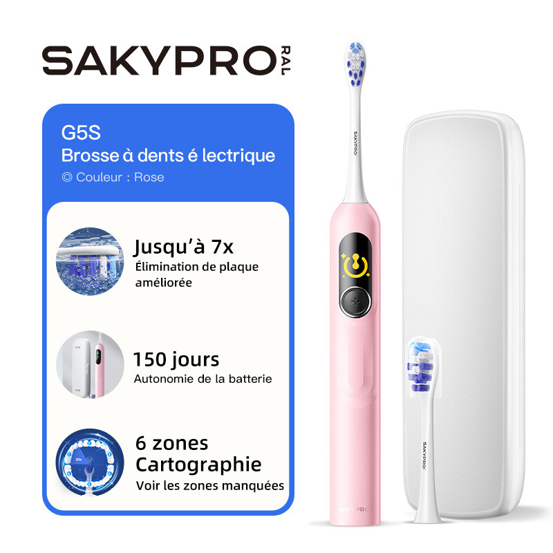 SAKYPRORAL Brosse à Dents Electrique Intelligente IA pour Enfants & Adultes avec Ecran LED | Autonomie 150 Jours, Carte de Brossage en Direct | Minuterie 3 Min, Etui de Voyage | Cadeau Brosse à Dents Sonic pour Famille & Noël (G5S Rose)