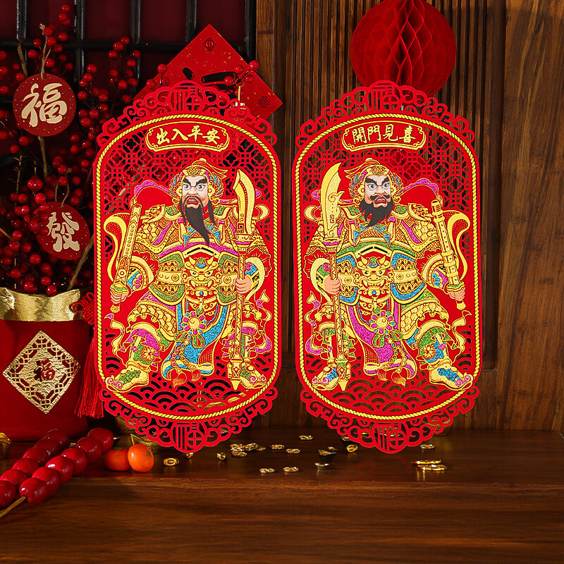 Lot de 2 Autocollants Dieux de la Porte 43cm pour le Nouvel An Chinois, Stickers Auto-adhésifs Men Shen Décorations Fête du Printemps Wu Fu Lin Men