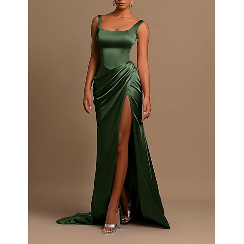 Sirena Tromba Strascico a Terra Abiti da Ballo Sexy Spacco Alto Senza Maniche Senza Spalle Formale Ospite di nozze Raso con Arricciato Spacco