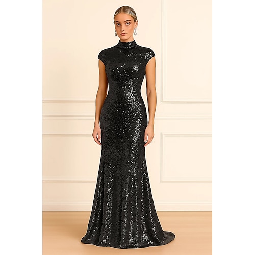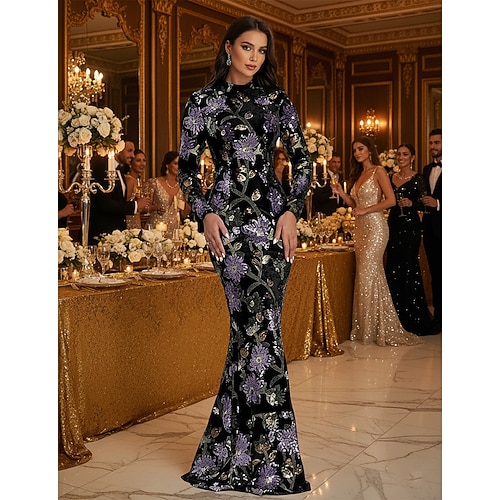 Sirena Tromba Lunghezza al pavimento Abito da Sera Elegante Scintillante Stile Celebrità Manica Lunga Collo Alto Festa in giardino Matrimonio Con Paillettes con Glitter