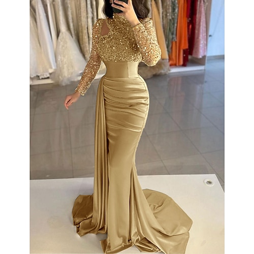 Sirena Tromba Lunghezza al pavimento Abiti da Ballo Abito da Sera Da principessa Abito formale Elegante Scintillante Stile Celebrità Manica Lunga Collo Alto Festa in giardino Matrimonio Raso Con