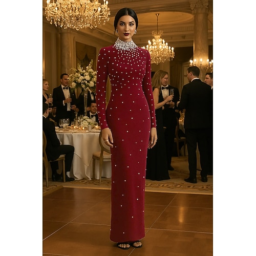 Sirena Tromba Tubino Colonna Lunghezza al pavimento Abito da Sera Elegante Scintillante Stile Celebrità Senza Maniche Collo alto Festa in giardino Matrimonio Crepe Elasticizzato con Applicazioni