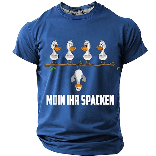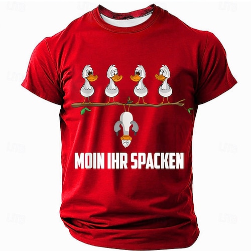 Maglia uomo divertente rossa a maniche corte con grafica tedesca 'Moin Ihr Spacken' design di anatra