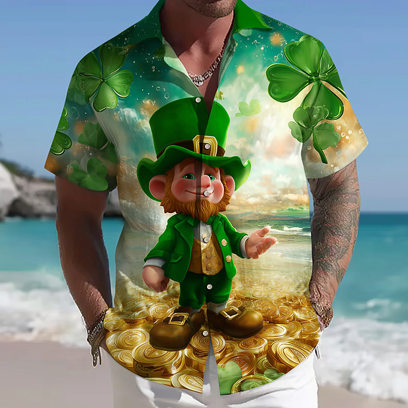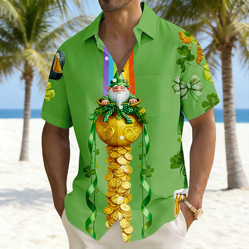 St. Patrick's Day Men's Shamrock Gold Coin Leprechaun Shirt Summer Shirt Button Up Shirt Short Sleeve Vintage Retro Holiday Summer Turndown 3D Print Front One Pocket Linen Like Shirt Green