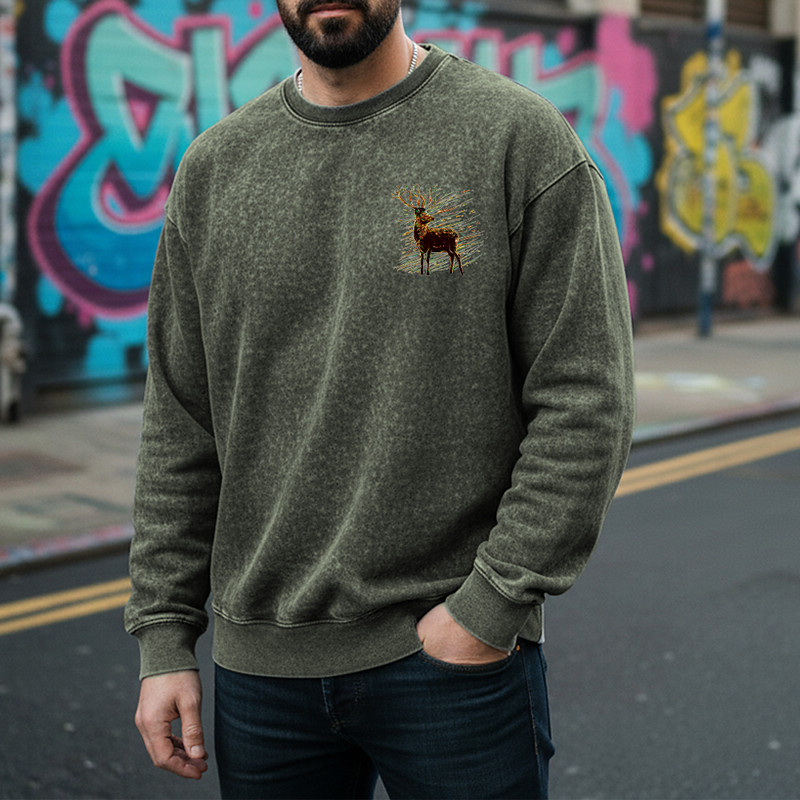 Men's Sweatshirt Distressed Hoodie Apricot Black Pink Army Green Brown Crew Neck Reindeer Print Daily Holiday Going out 100% Cotton Vintage Retro Casual Fall Winter Clothing Apparel Hoodies