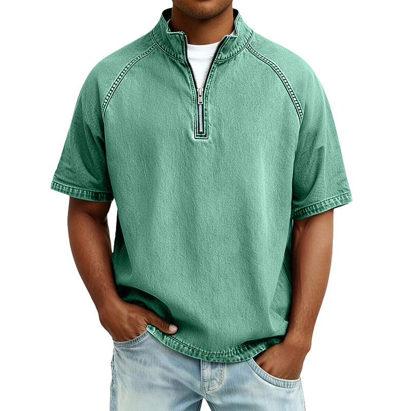 Men 100% Cotton Acid Wash Shirt Tee Top Short Sleeve Stand Collar Spring Fall Fall Winter Plain Vintage Streetwear Casual Zip Up Basic Casual Home Street Light Blue Black Brown Top Tee for Men