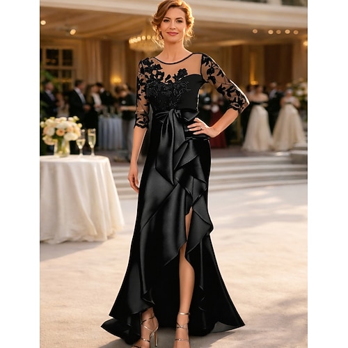 Linea ad A Asimmetrico Vestito da Festa Abito da Cocktail Abito da invitata a nozze Abito da cerimonia per signora Manica 3/4 Collo gioiello Abito Nero Alto Basso Ospite di nozze Autunno Raso con